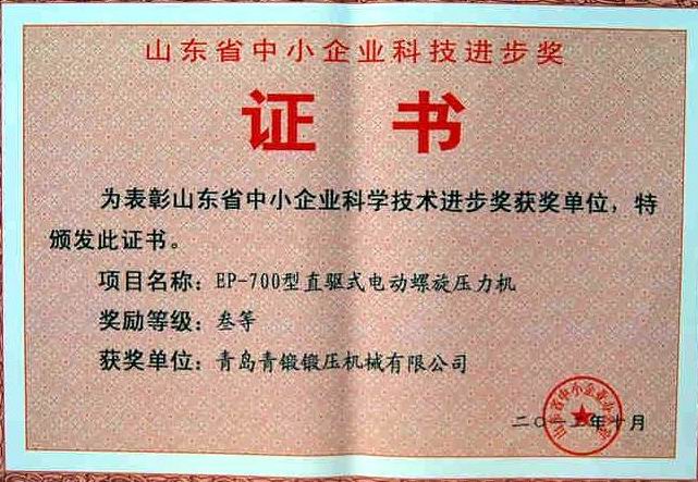 2012年,EP-700型直驅(qū)式機(jī)獲山東省級(jí)科技進(jìn)步三等獎(jiǎng)。
